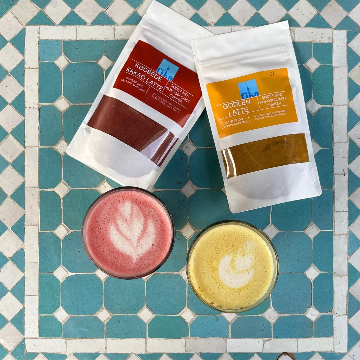 To farvede drinks med lattekunst, to poser med kaffepulver, en på rød bære og en på gul bære, Udvalg af økologiske produkter Fika.