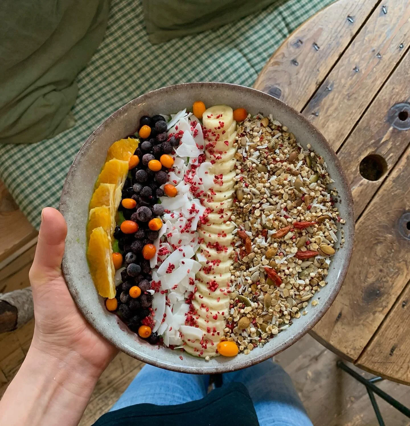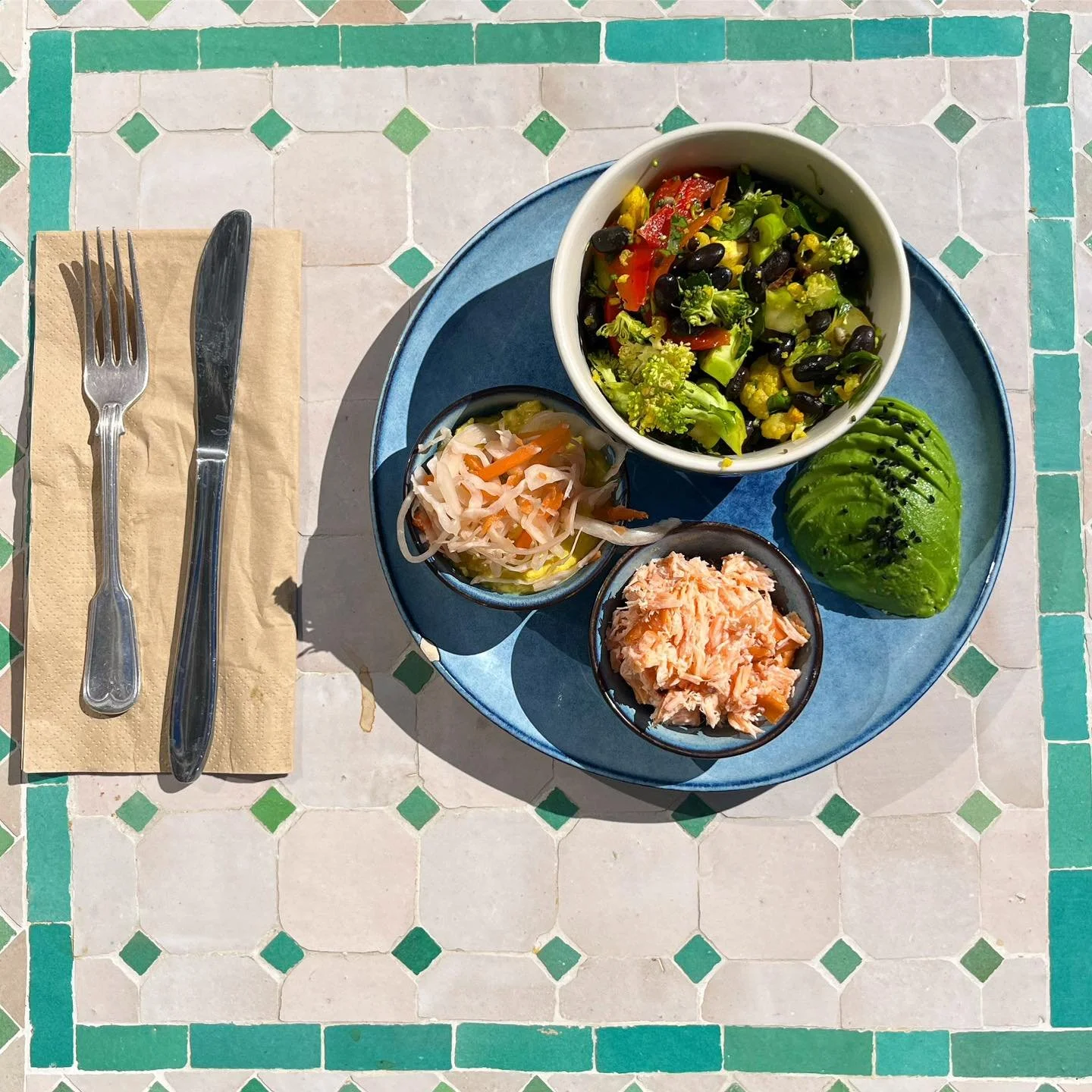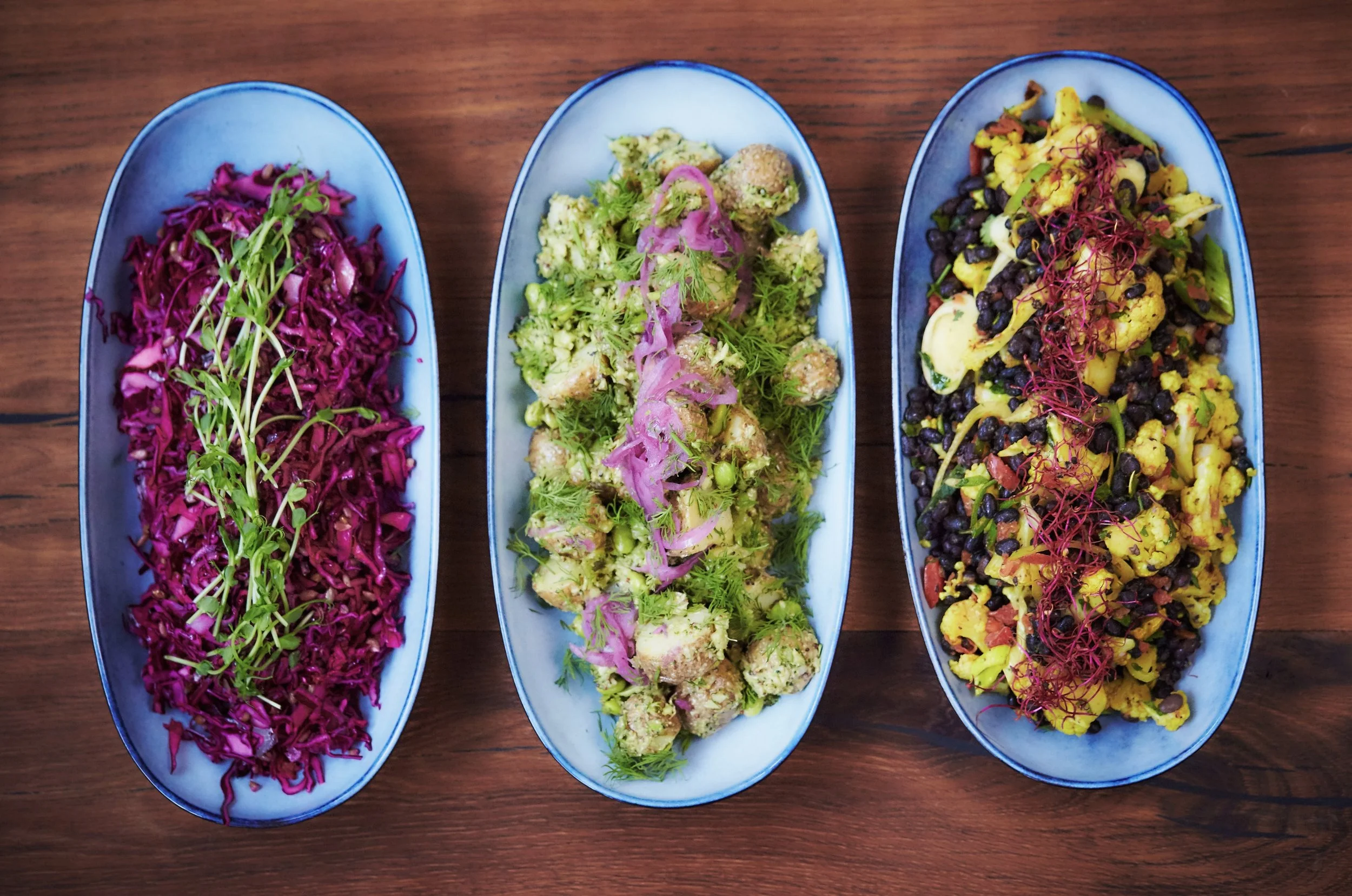 Tre fade blå serveringsskåle med forskellige økologiske salater på en træbord. Fika Aarhus, Risskov