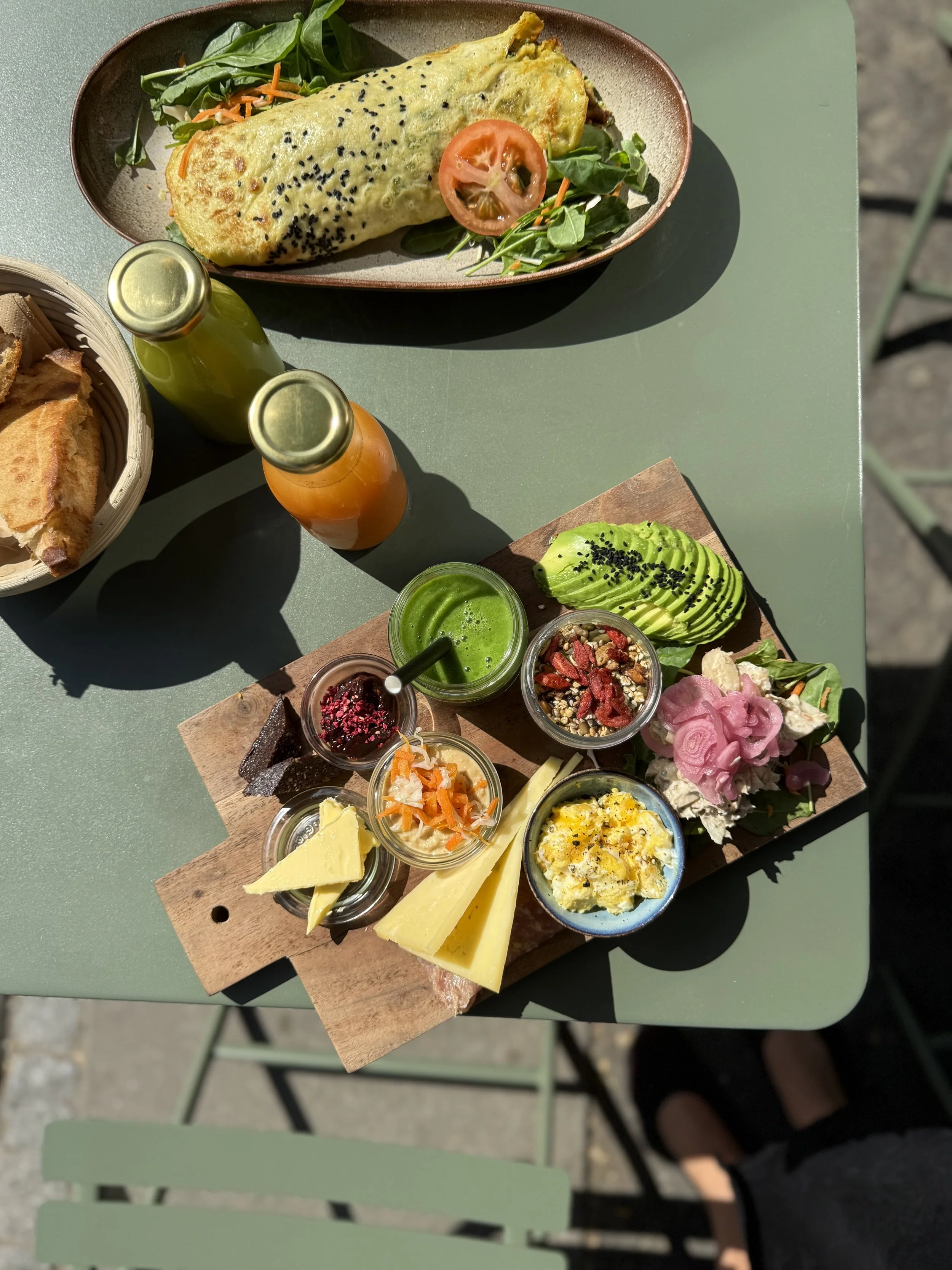 Billed af en frokost med æg-omelet på en tallerken med salat, og en træpande med avocadoskiver, oste, juices, små skåle med yogurt, granola og røde hindbær, samt snacks.
