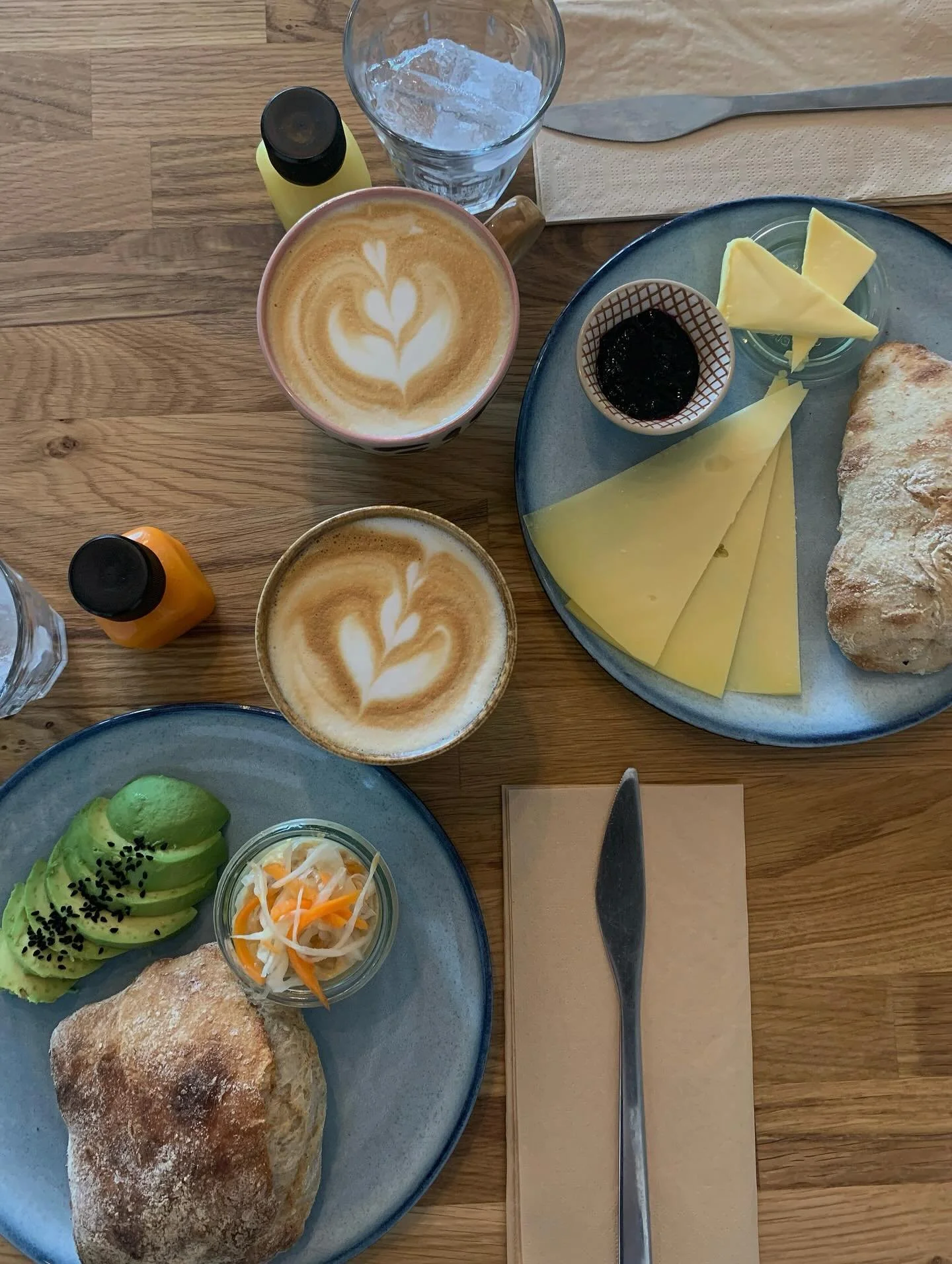 Morgenmad med to kopper cafe latte med hjerteformet skum, to glas vand, ost, brød, avocado, syltetøj, æg, grøntsager og smør på tallerkener.