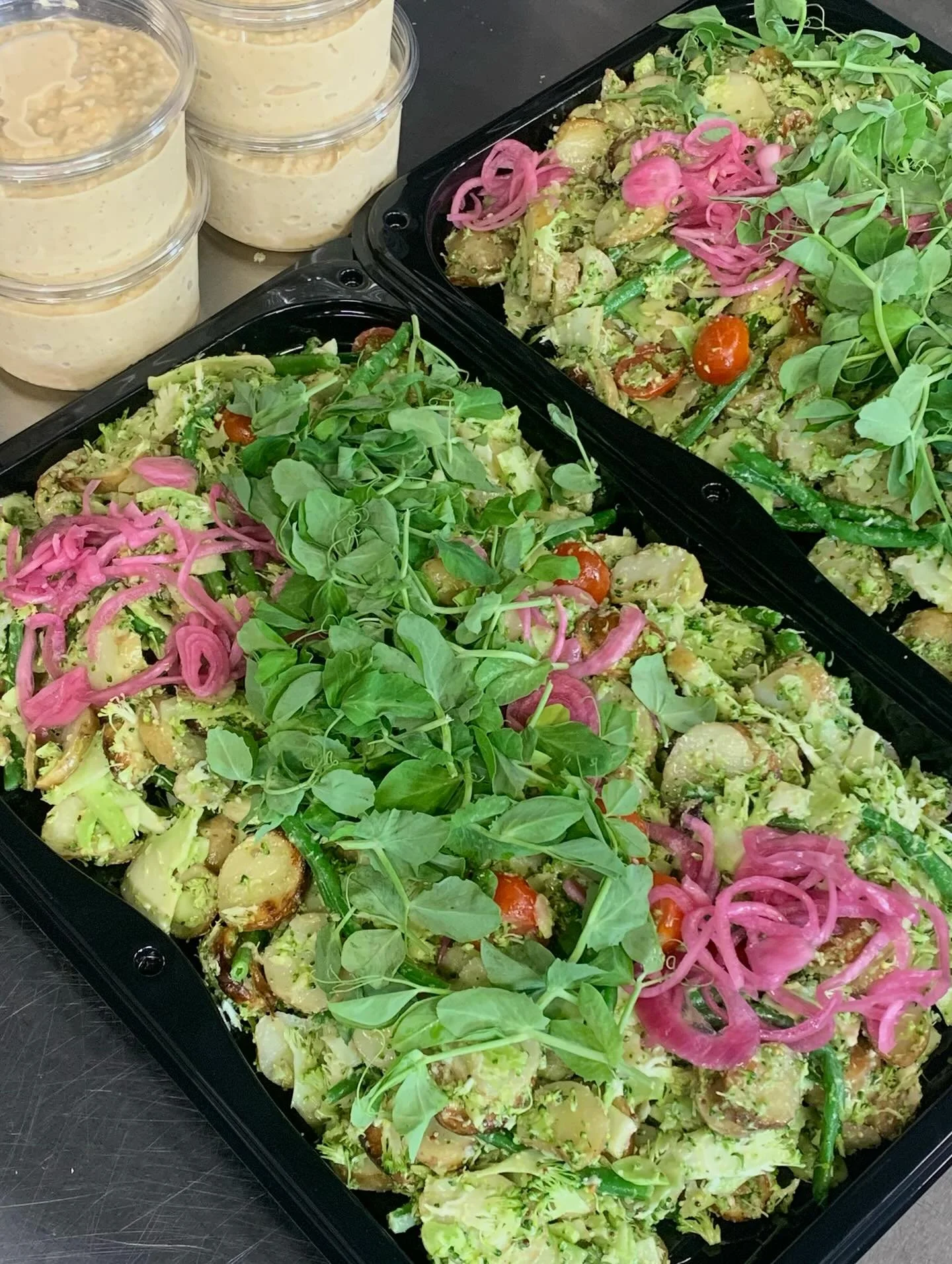 Økologisk salat med grøntsager og urter, økologisk hummus