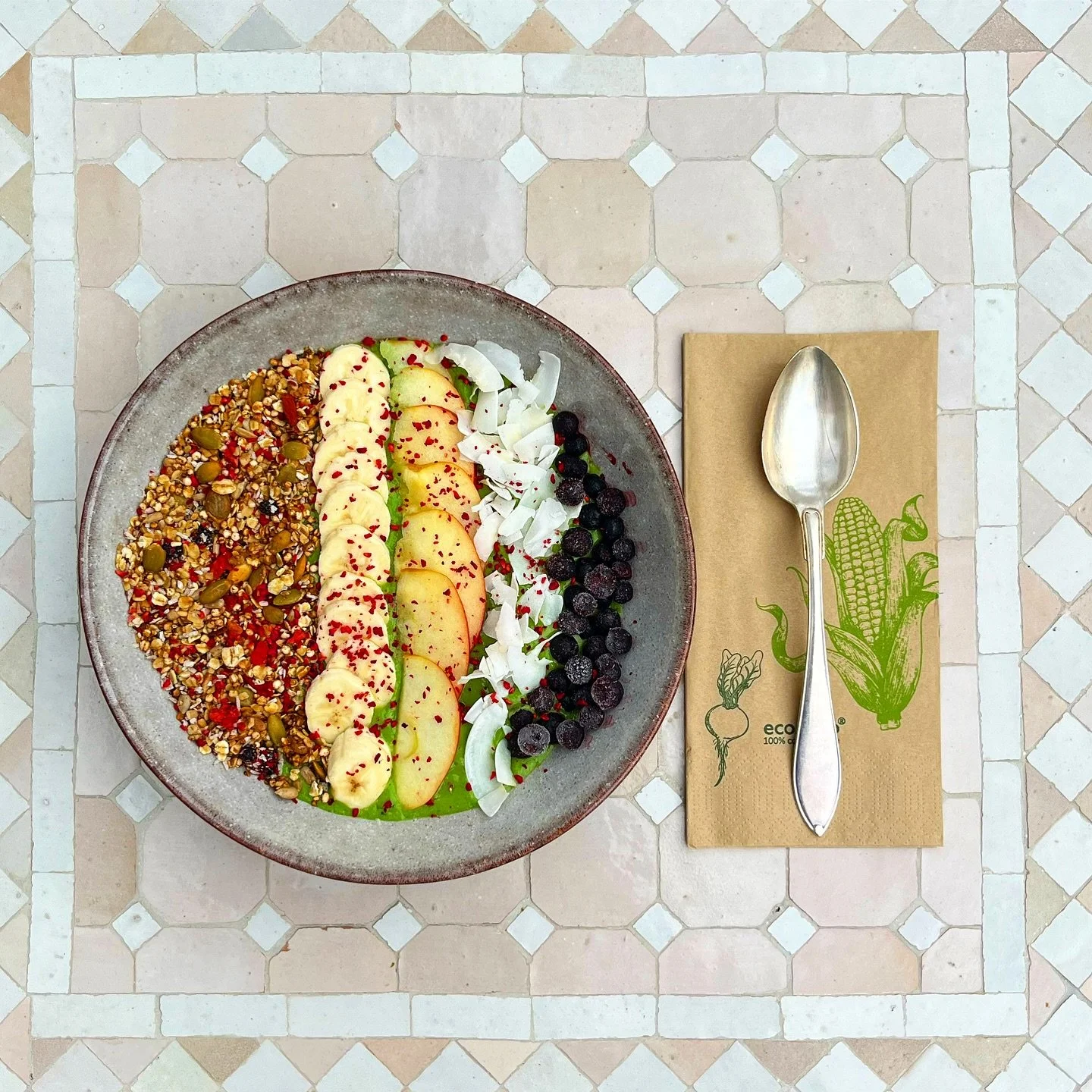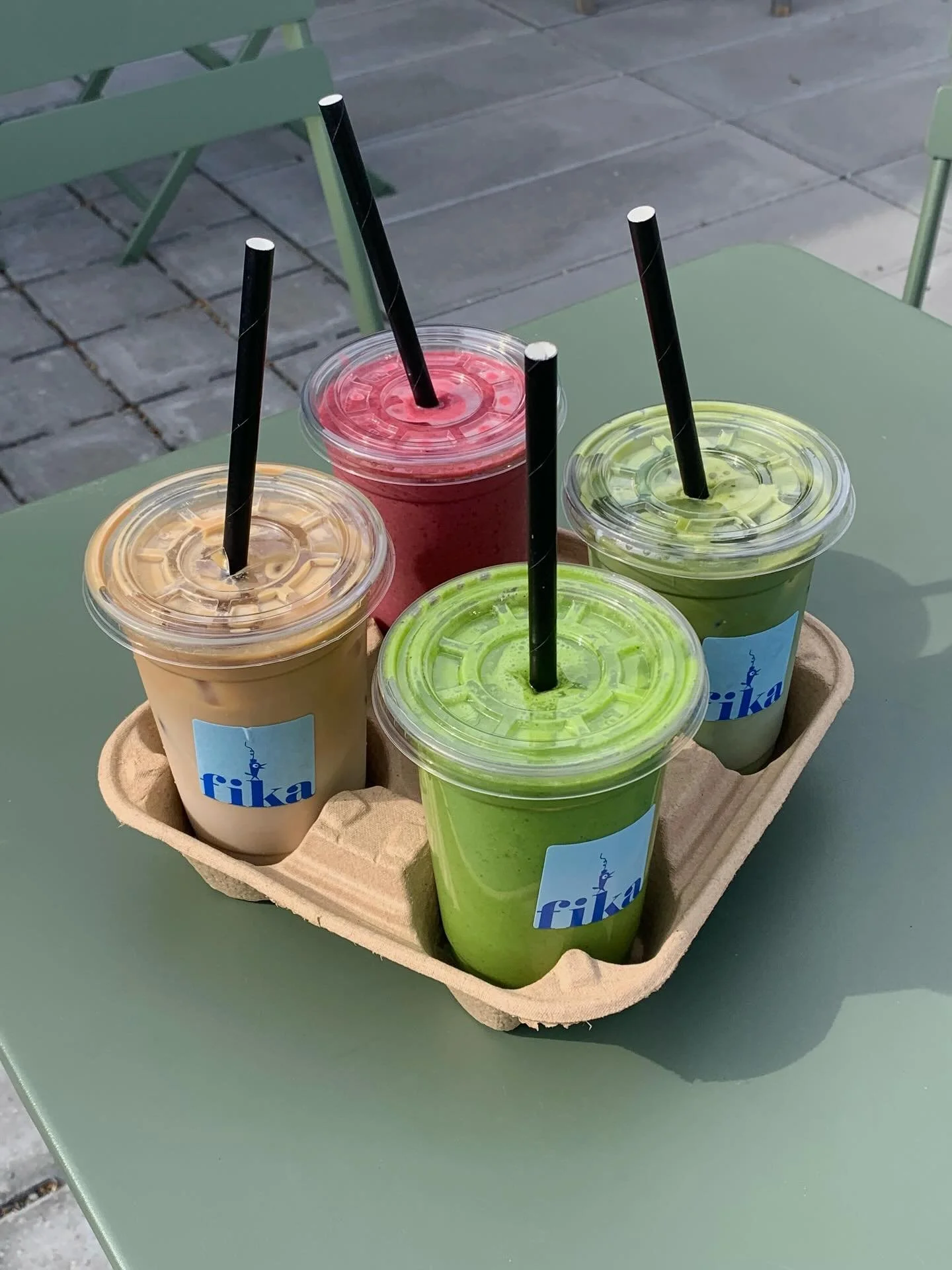 Smoothies og juice – farverige smoothies i bionedbrydelig emballage med Fika-logo.