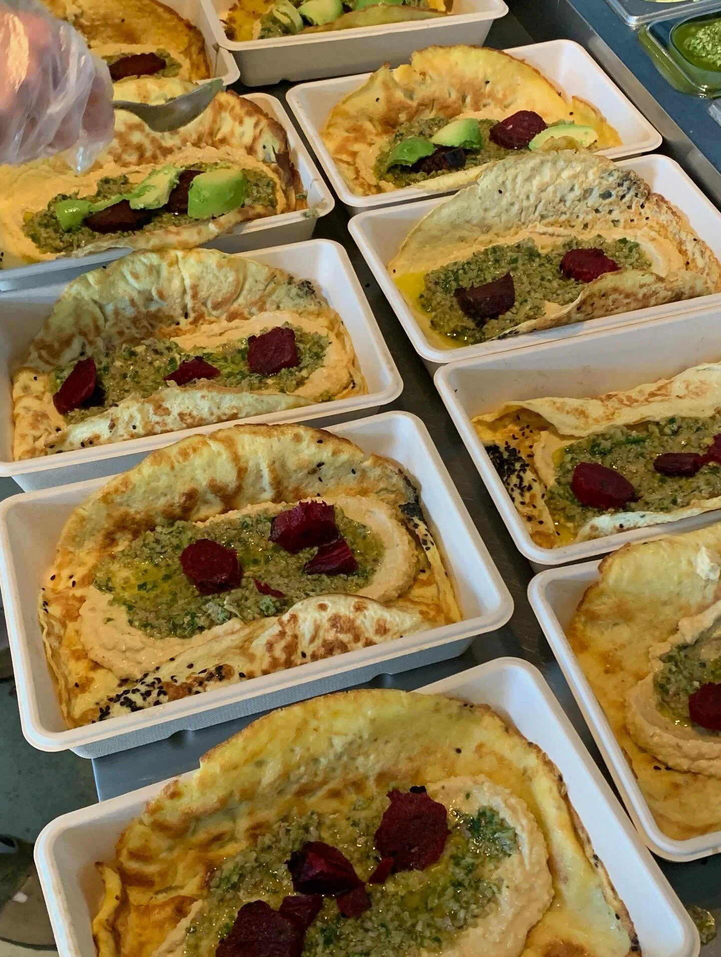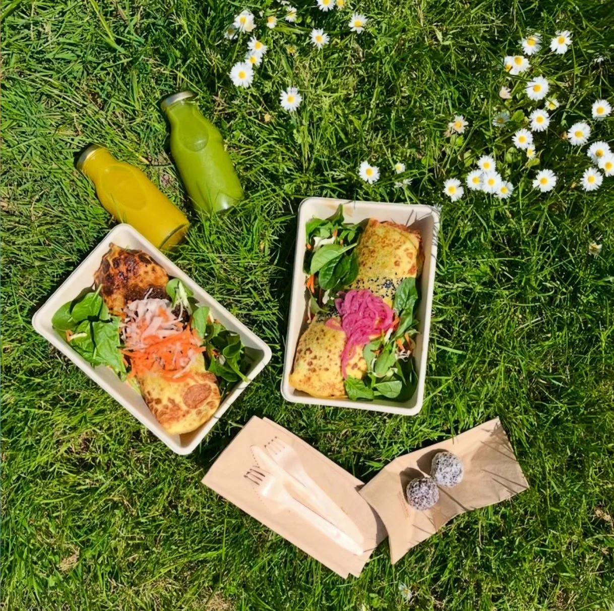 Vegetariske pandekager – økologiske pandekager med grøntsagsfyld og topping.