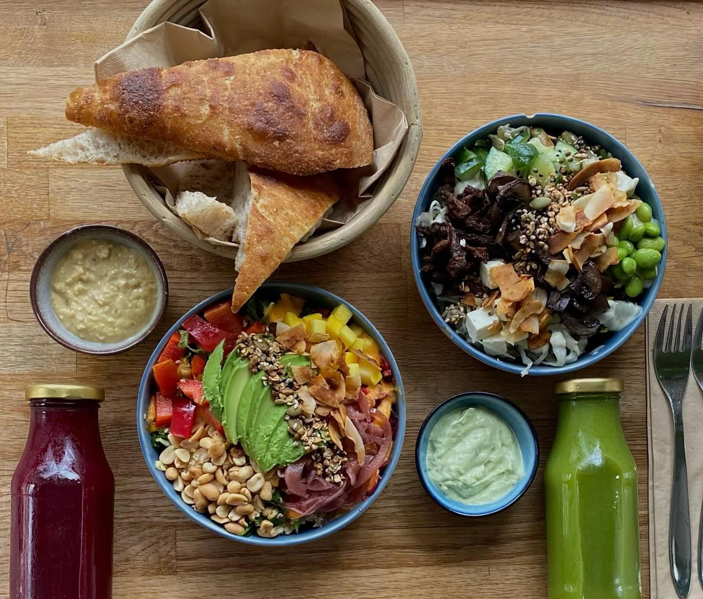 To økologiske salatskåle med frisk grønt, avocado, nødder og frugt, et fad med fladbrød, og to drikkevarer, en rød og en grøn, på et træbord.