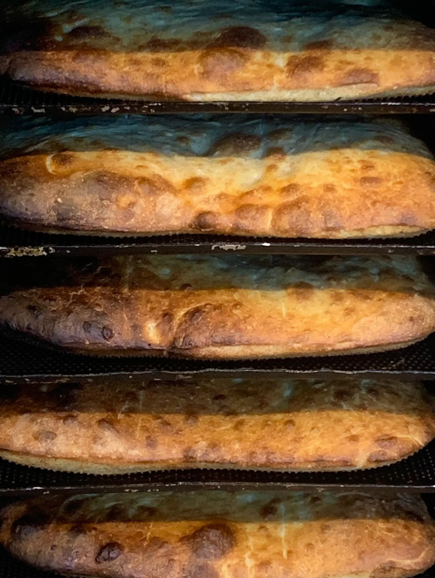 Friskbagt brød, der ligger i en ovn. Brødene er gyldne og sprøde.
