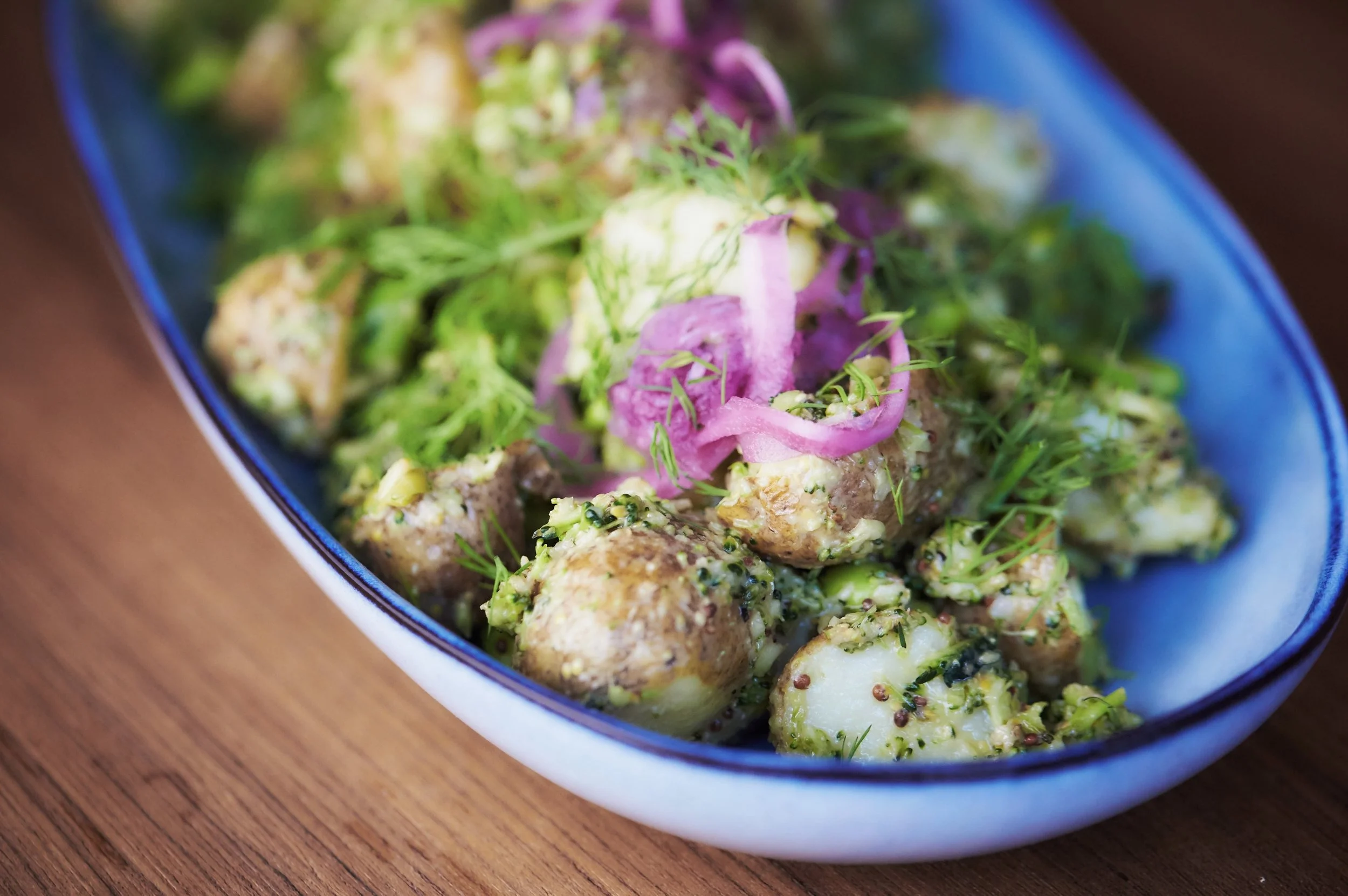 Bæddike salat med kartofler, friske urter og rødløg i en blå skål på træbord.
