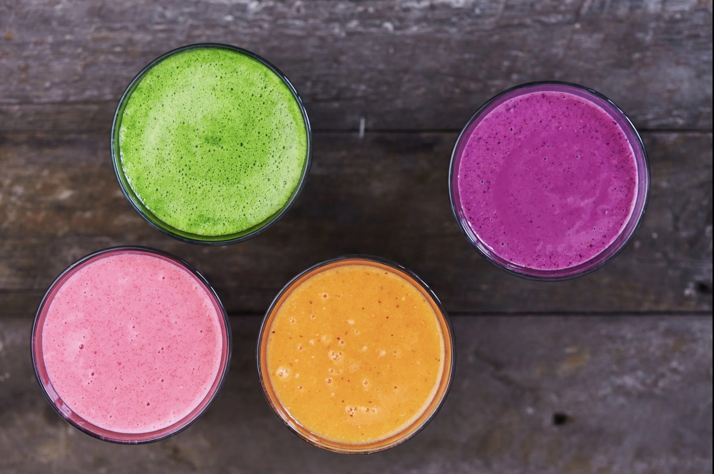 Fire farvede smoothies i glaskop med grøn, pink, orange og lilla farver, set ovenfra på en træoverflade.
